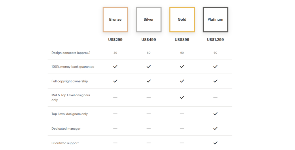 Bronze | $299 | Basic package with limited design concepts and entry-level designers. |