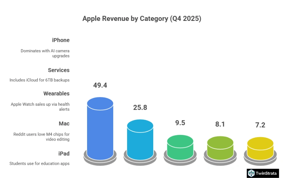 iPhone dominates at 49.2% of Q4 2025 revenue, $49.4 billion. You upgrade for AI cameras that edit photos automatically. Services follow at $25.8 billion (25.7%), including iCloud for 6TB backups at $9.99/month.