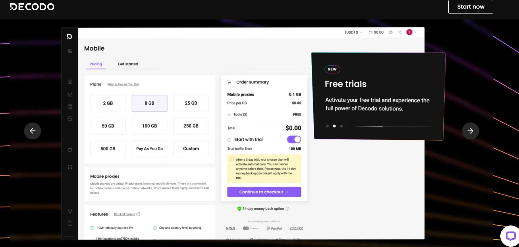 For Instagram, Decodo is especially effective because of its mix of residential, datacenter, and mobile proxies. Residential proxies start at $1.50 per GB, datacenter proxies cost as little as $6 per month, and mobile proxies are priced at $20 per GB.