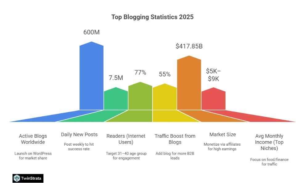 Blogging statistics 2025 confirm: 600M blogs, 77% readers, $417.85B market exploding to $2T. 55% traffic boosts, 13x ROI for bloggers.