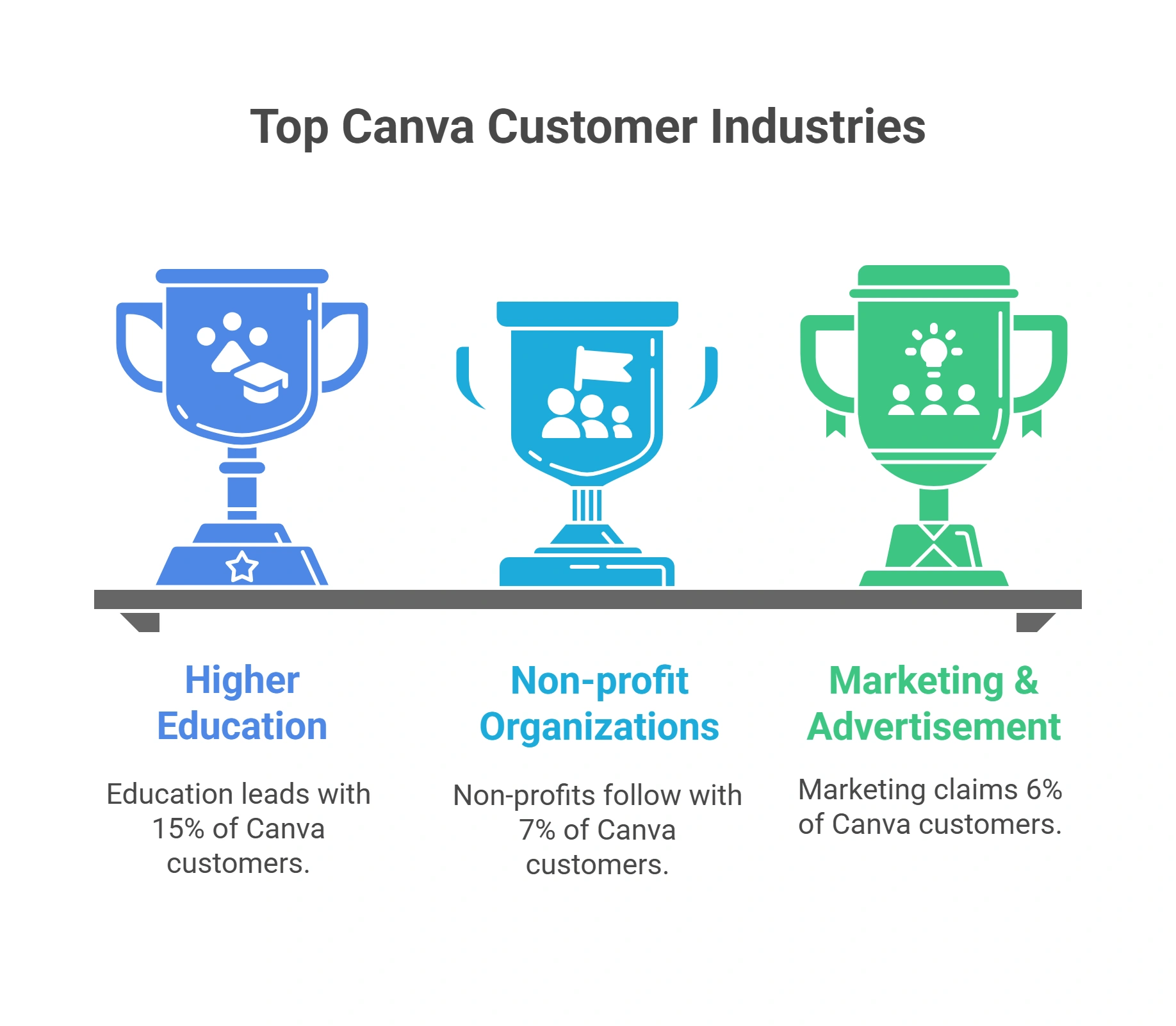 Industries love Canva. Education leads with 15% of customers. Non-profits follow at 7%. Marketing and IT each claim 6% and 5%. Over 83,000 companies use it, from startups to enterprises.