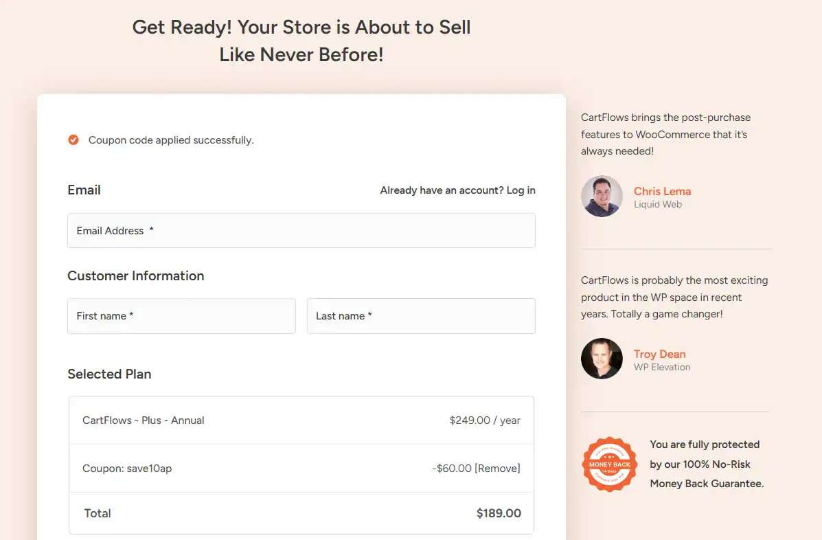 Get CartFlows Plus for $189/year (was $249/year). Boost your store’s average order value with powerful sales funnels
