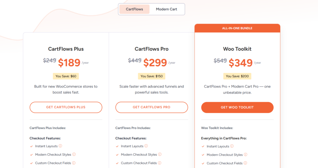 Woo Toolkit$349Everything in CartFlows Pro + Modern Cart ProAll-in-one bundle, unbeatable price
