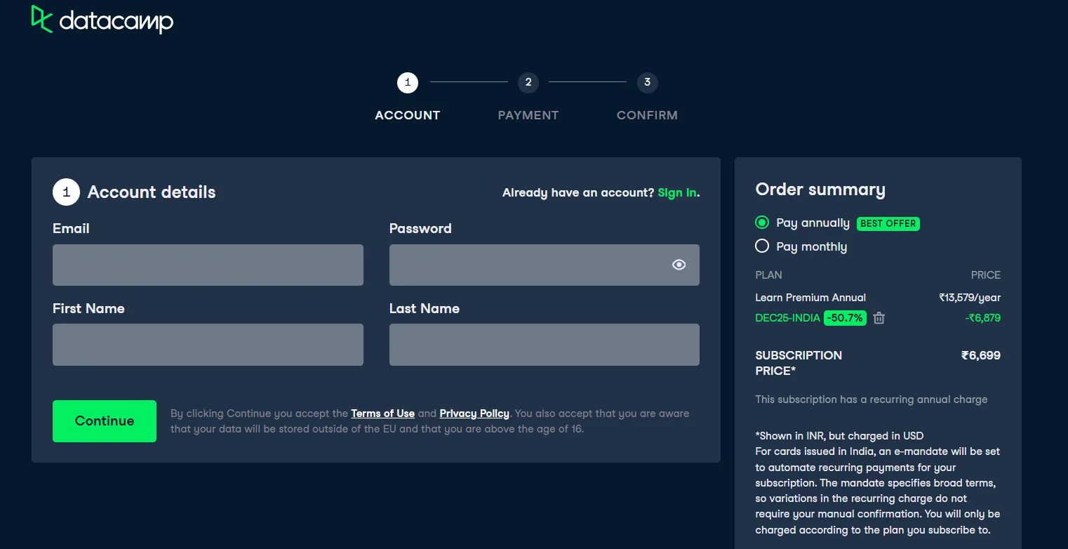 Step 2: Once on the Datacamp website, choose the subscription plan that fits your needs, whether it’s a monthly or yearly plan, or a specific course, & Fill in the account details.