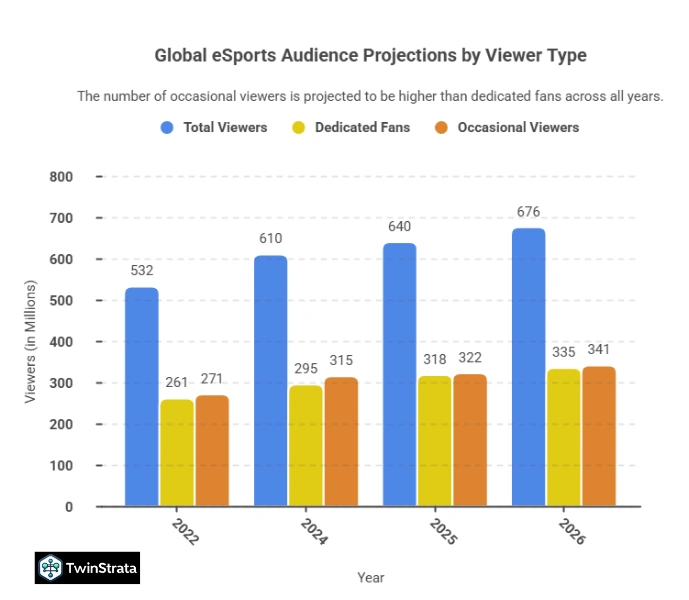 In 2026, the global eSports audience is estimated at around 676 million viewers. This includes about 335 million dedicated fans and over 340 million occasional viewers who tune in during major events.