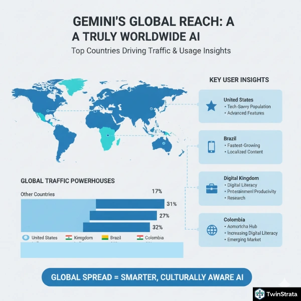 Geographically, the United States drives 14.6% of traffic, the highest share. Users access Gemini from over 230 countries, showing global appeal. In 2025, emerging markets like India and Brazil see fast growth due to mobile access.
