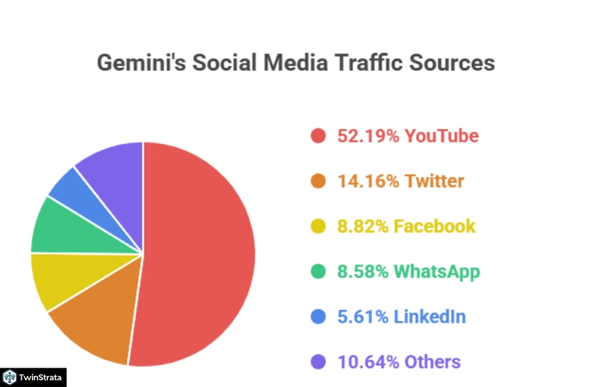 Social media drives key visits. YouTube leads with 52.19%, Twitter (now X) at 14.16%, Facebook 8.82%, WhatsApp 8.58%, LinkedIn 5.61%, and others 10.64%. Google promotes via ads and Search integrations.