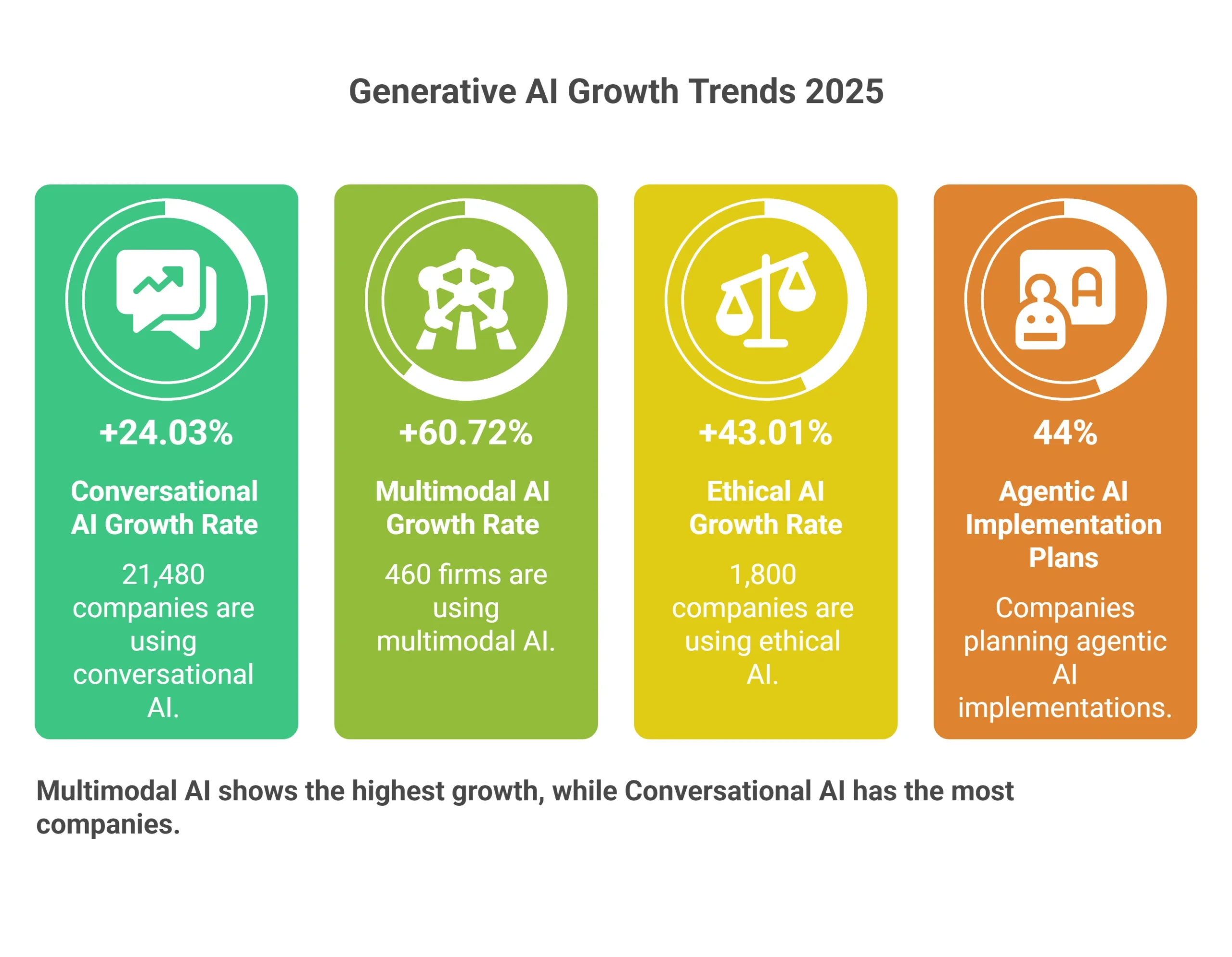 Conversational AI leads with 21,480 companies, 24.03% growth. Multimodal AI (text, image, video) grows 60.72%, 460 firms. Ethical AI surges 43.01%, addressing bias.