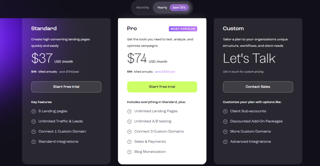 At $37/month, the Standard plan delivers high-converting templates, unlimited leads, and 40+ integrations, saving $50-$100/month compared to Unbounce or ClickFunnels. The Pro plan ($74/month) adds A/B testing and payments, driving my clients’ revenue by $5,000+/month.