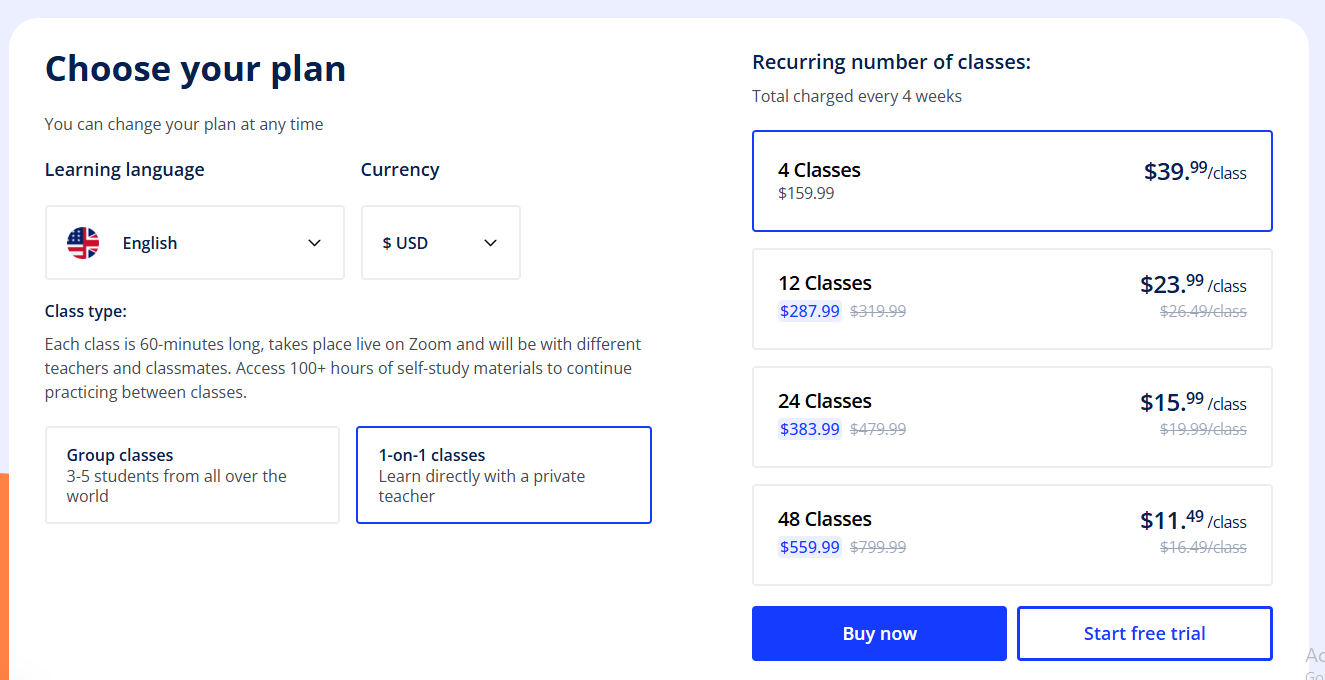 Lingoda offers flexible language learning plans with both group and private classes. Here’s an overview of their pricing: