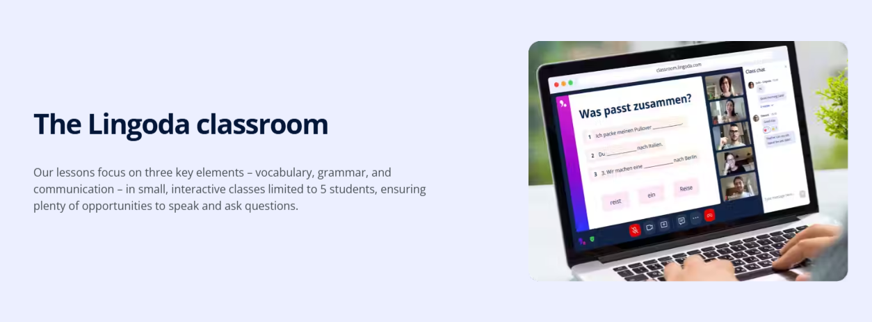 Lingoda offers a choice of private or group classes, with both types available 24/7.