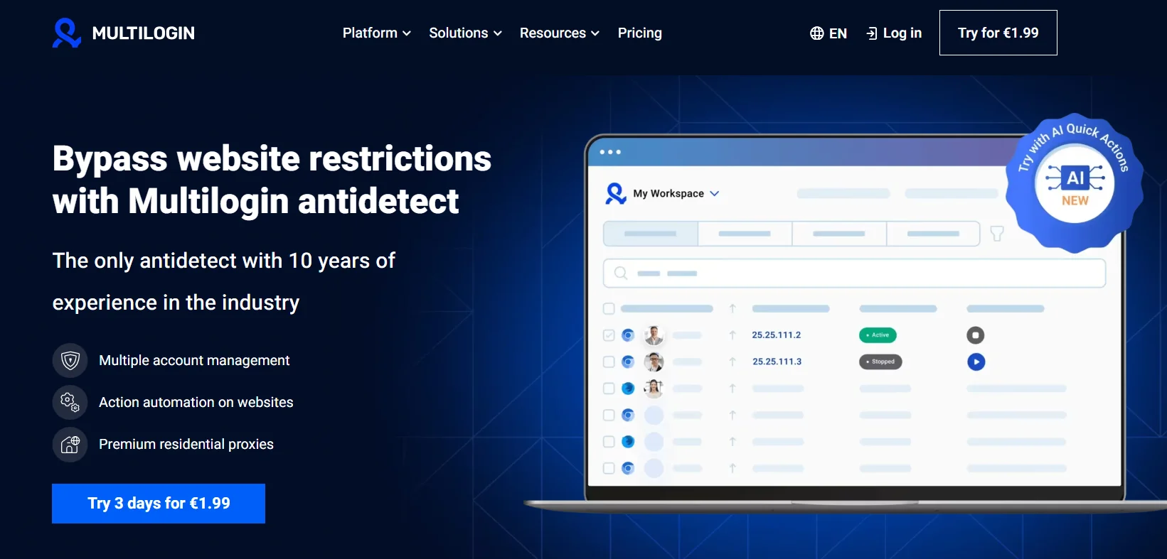 Multilogin is a browser tool that lets you manage multiple online accounts without getting detected or blocked. I highly recommend it if you want a safe and simple way to keep each account separate and protected.