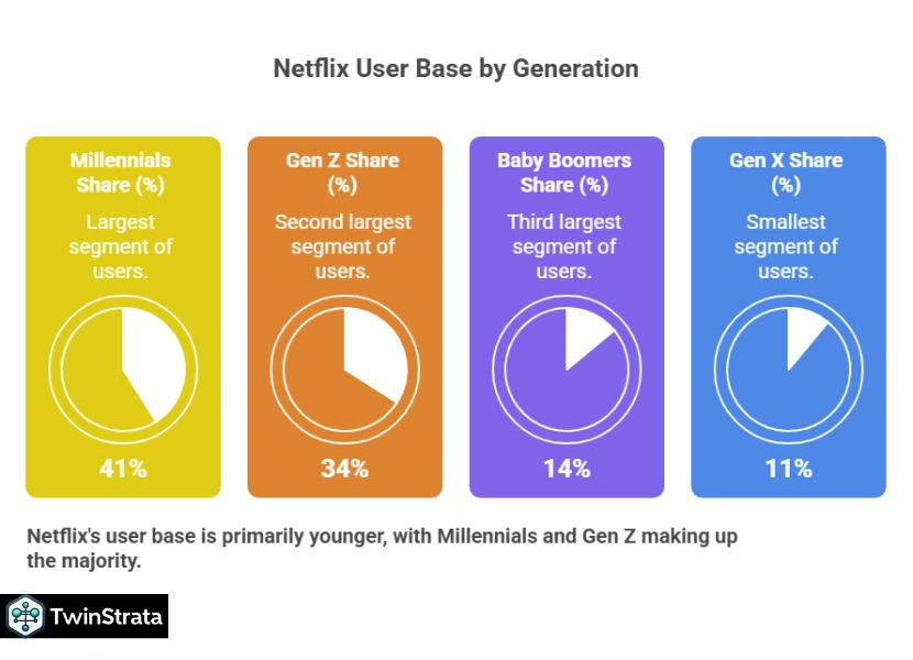 Millennials (41%) and Gen Z (34%) dominate Netflix’s user base, reflecting its appeal to younger audiences. Baby Boomers (14%) and Gen X (11%) also contribute significantly.