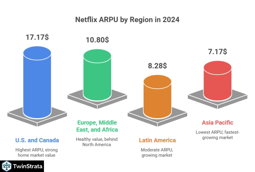 Netflix’s global ARPU in 2024 was $11.7, with the U.S. and Canada leading at $17.17. The Asia Pacific region has the lowest ARPU at $7.17, reflecting affordable pricing strategies.