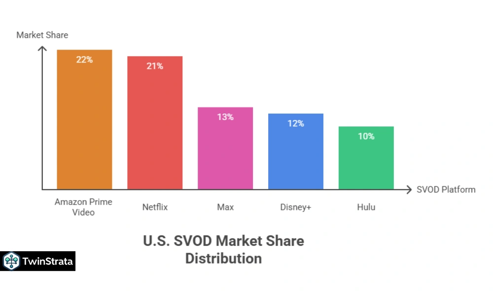 Netflix holds a 21% market share in the U.S. SVOD market, trailing only Amazon Prime Video (22%). Its diverse content and innovative features keep it ahead of competitors like Disney+ (12%) and Hulu (10%).