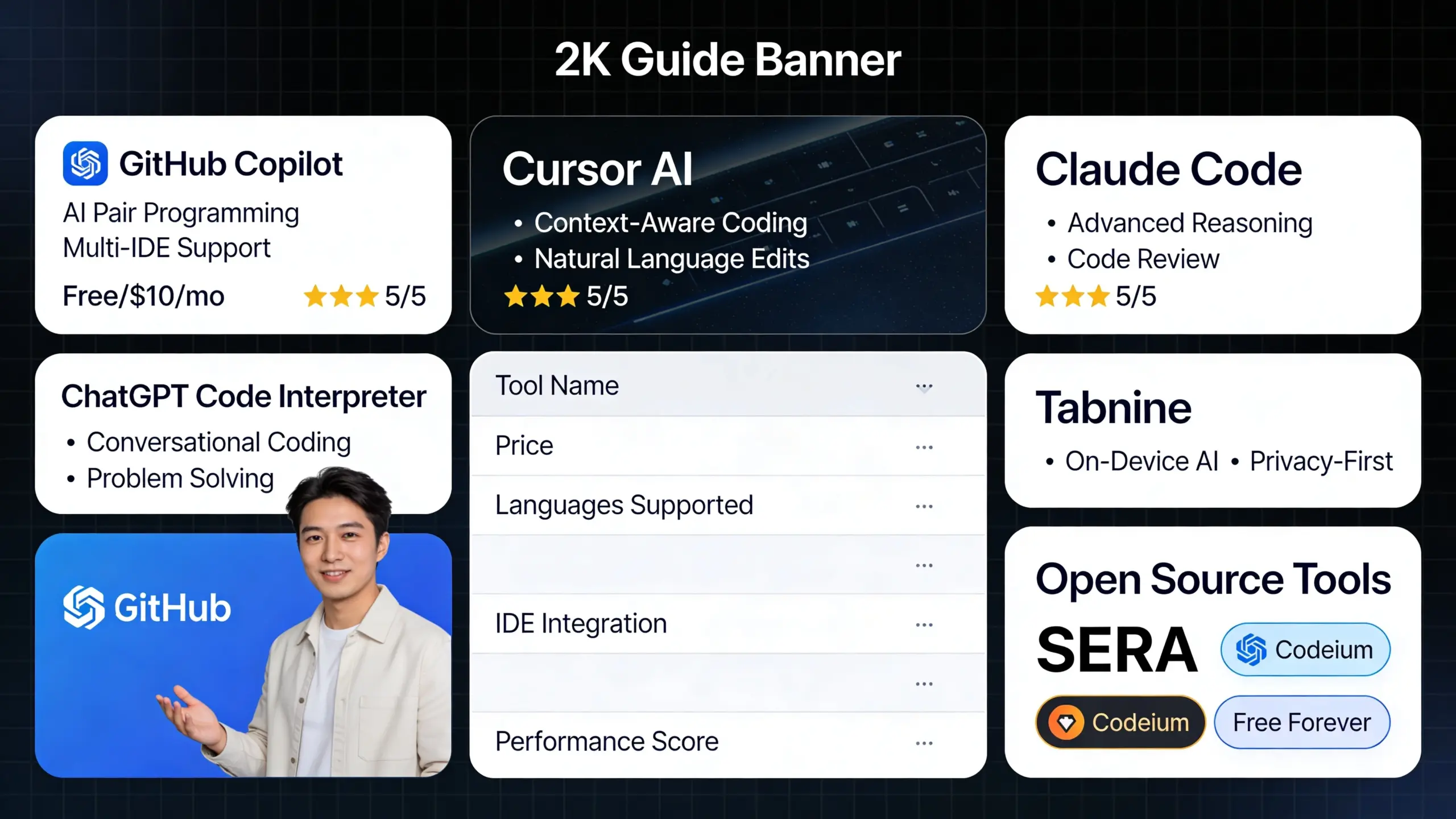 Many tools lead the market. GitHub Copilot stays popular. Cursor excels in full codebase work. Claude shines in reasoning. Here are key players: