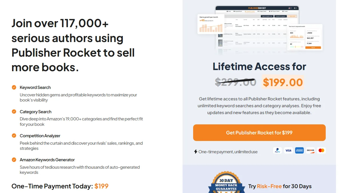 Publisher Rocket follows a one-time payment model. In 2026, the price is $199. You pay once and can use the software without any ongoing fees.