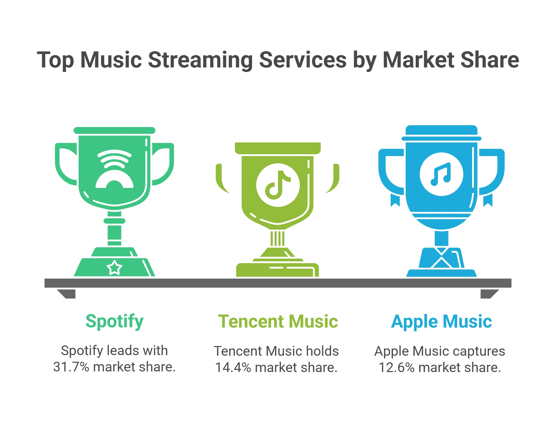 Spotify’s market share stands at 31.7%, ahead of Tencent Music (14.4%) and Apple Music (12.6%).