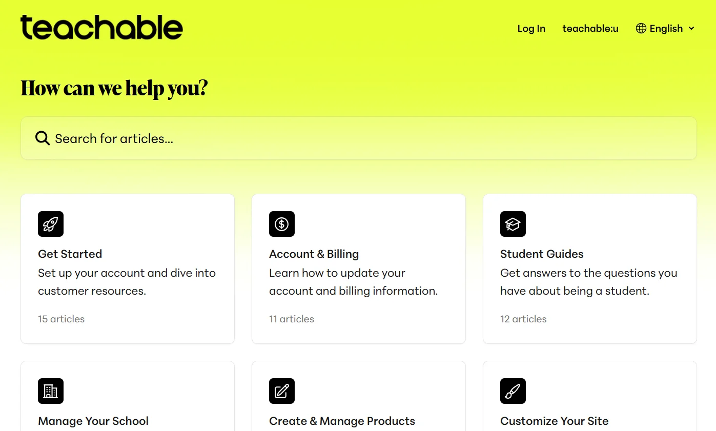 Teachable offers a well-organized Help Center to assist users with various aspects of the platform. It provides a simple search bar to find relevant articles, making it easy to get answers to your questions. The key sections include: