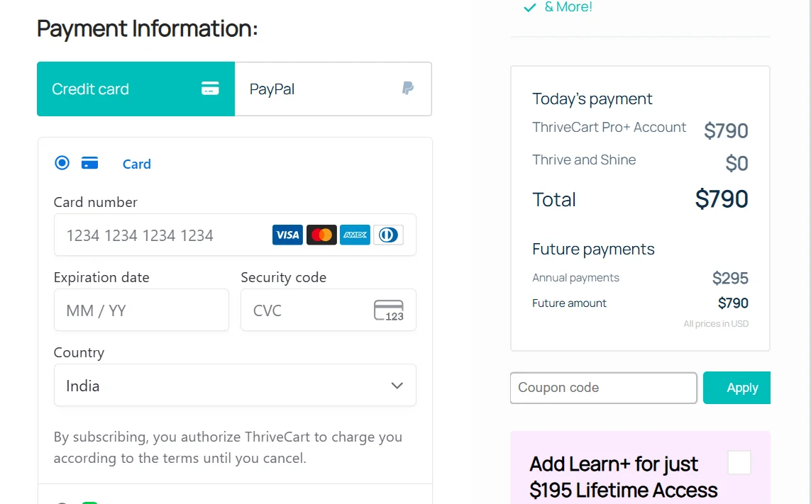| ThriveCart Standard | $495 | Unlimited bump offers/upsells, basic LMS (Learn), custom cart pages, payment integrations, coupons/discounts, A/B testing | Lifetime access |