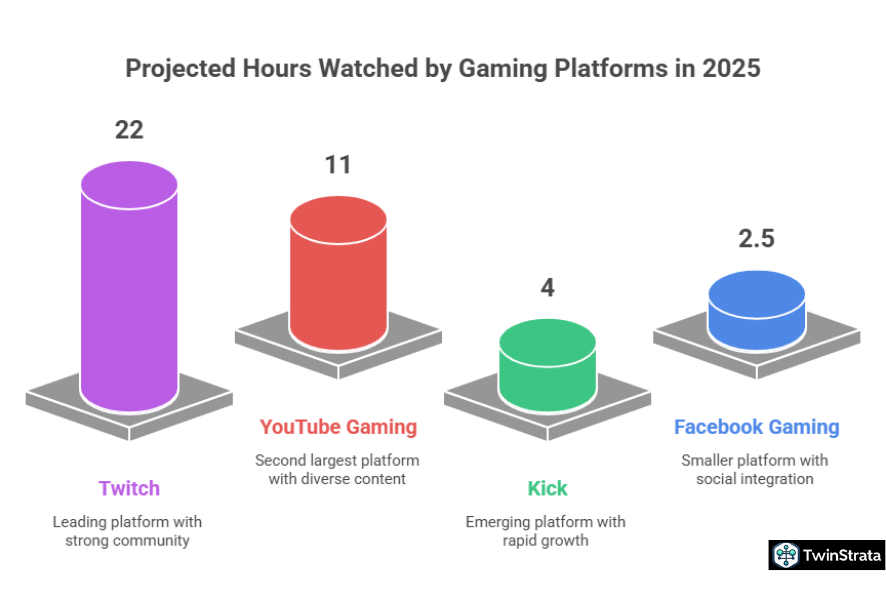 Twitch leads 2025 with 22 billion projected hours watched, doubling YouTube Gaming’s 11 billion, but faces pressure from Kick’s rapid 4 billion growth, making hybrid strategies key for broader reach.