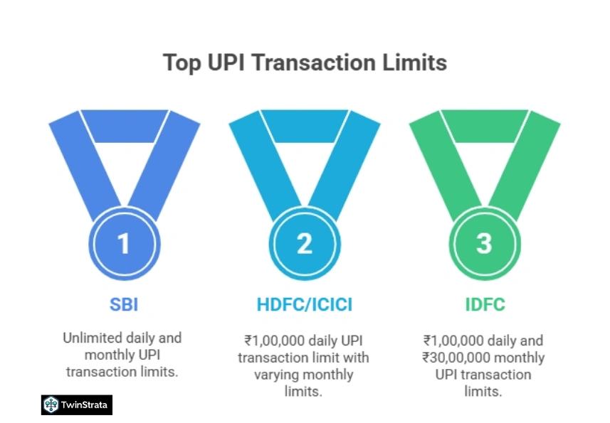UPI statistics 2025 include smart caps: 20 daily transactions, ₹1L via major apps. Monthly: ₹30L (IDFC), unlimited (SBI). Banks vary—HDFC/ICICI ₹1L daily.