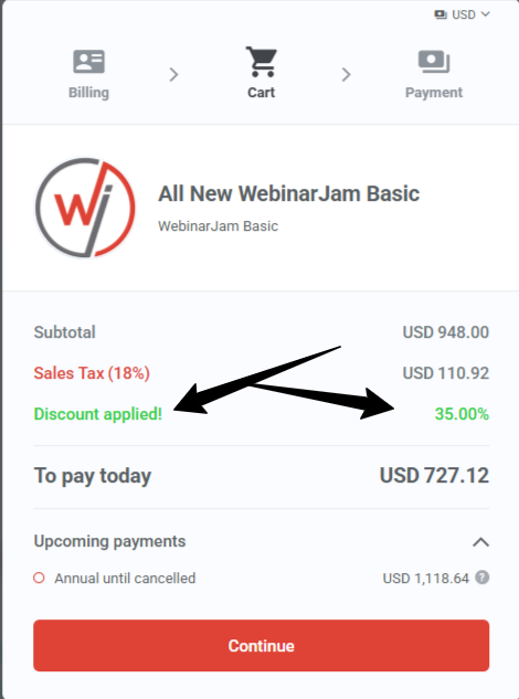 Step 6: Complete the payment process and start using your discounted WebinarJam subscription.