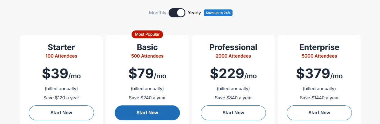 - Up to 500 Attendees: The Basic plan supports up to 500 attendees.