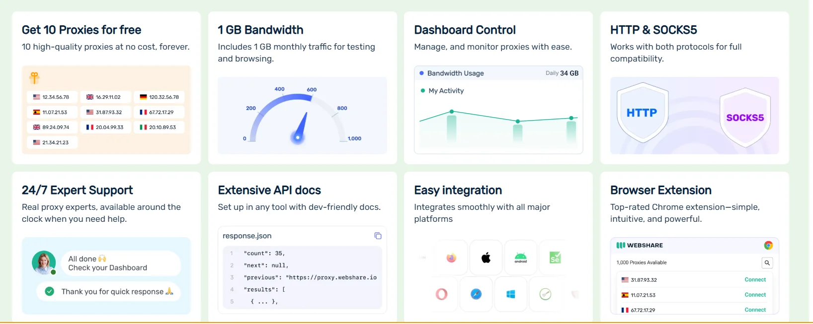 Webshare includes a permanent free plan where users receive 10 premium proxies and 1 GB of data each month. You only need an email to create an account.