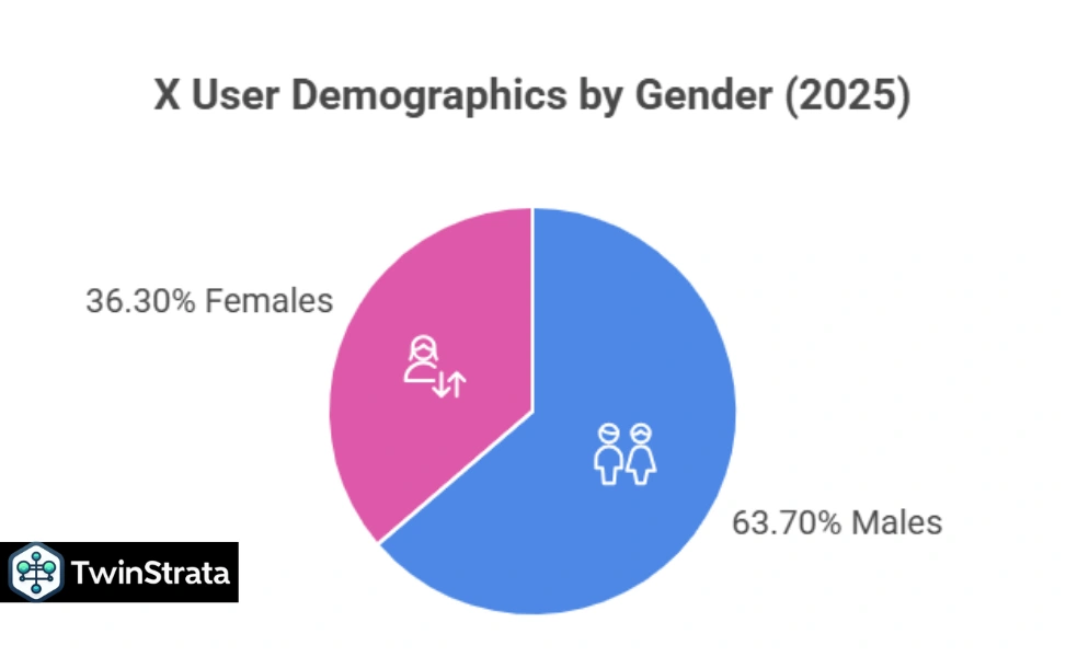 In 2025, 63.7% of X users are male, and 36.3% are female. The largest age group is 25 to 34-year-olds, accounting for 37.5% of the user base.
