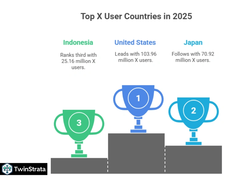 As of 2025, the United States continues to lead with a substantial 103.96 million X users. Japan and Indonesia follow, with India now ranking fourth.