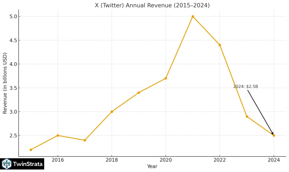 X generated $2.5 billion in revenue in 2024, marking a 13.7% decline year-on-year compared to $2.9 billion in 2023. This dip is largely attributed to advertisers leaving the platform in 2023.